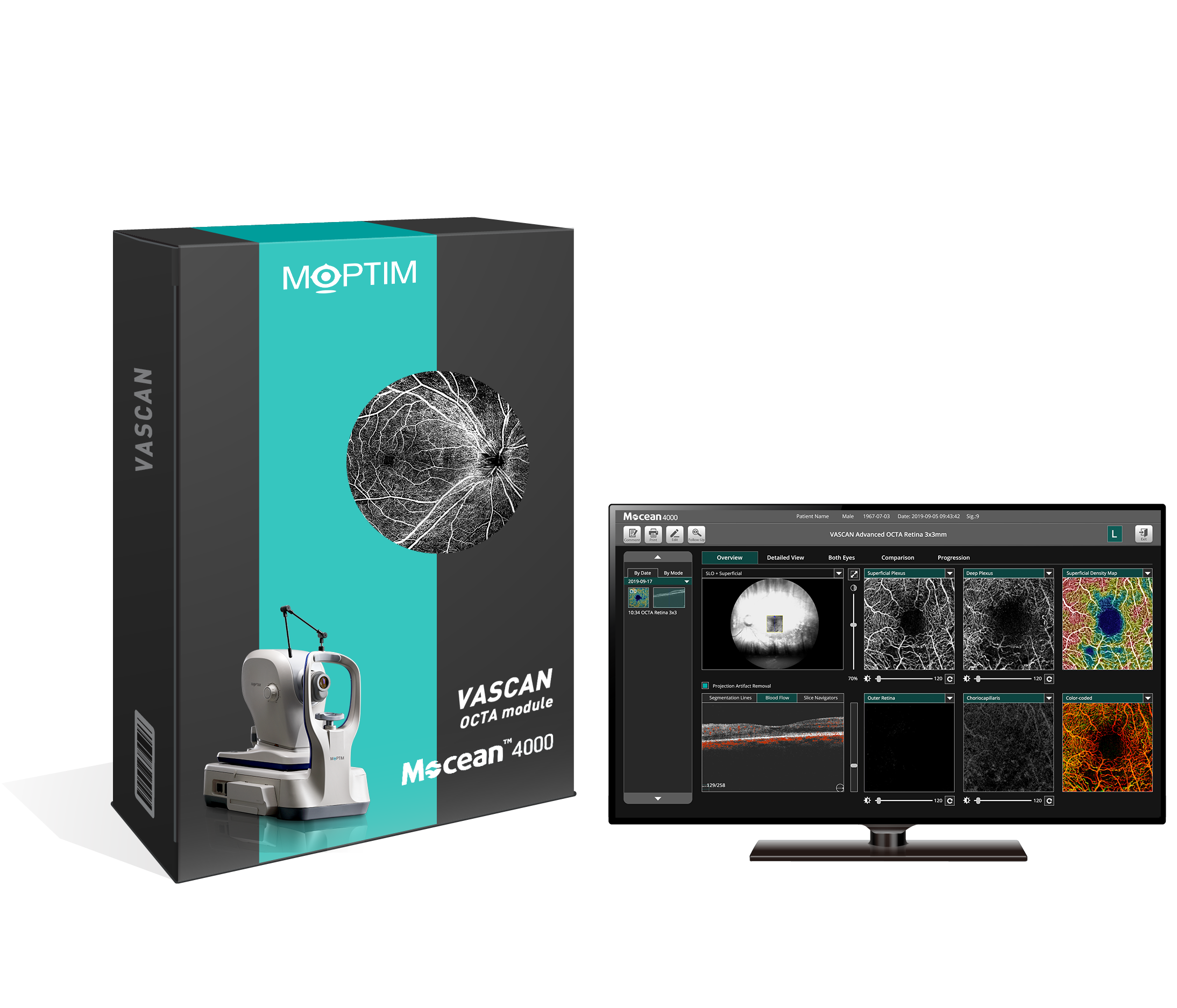 The VASCAN™ OCTA module offers non-invasive visualization of retinal microvasculature without dye injection. It provides detailed vascular imaging, quantitative analysis (vessel density, FAZ, flow), and widefield scans up to 12 × 8 mm—expanding the diagnostic capabilities of the platform.
